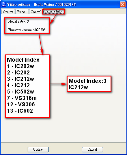 The “Camera Info” is on the “Video Settings” of CamView for each network camera.
